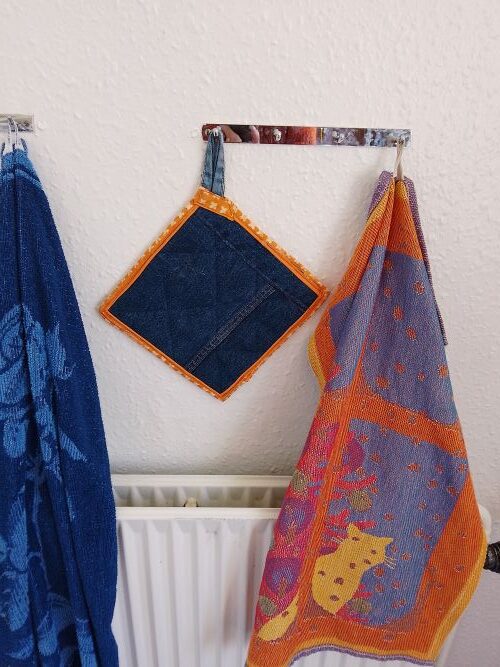 Grydelapper syet af tøjrester. Viskestykke og håndklæde fra genbrugen.