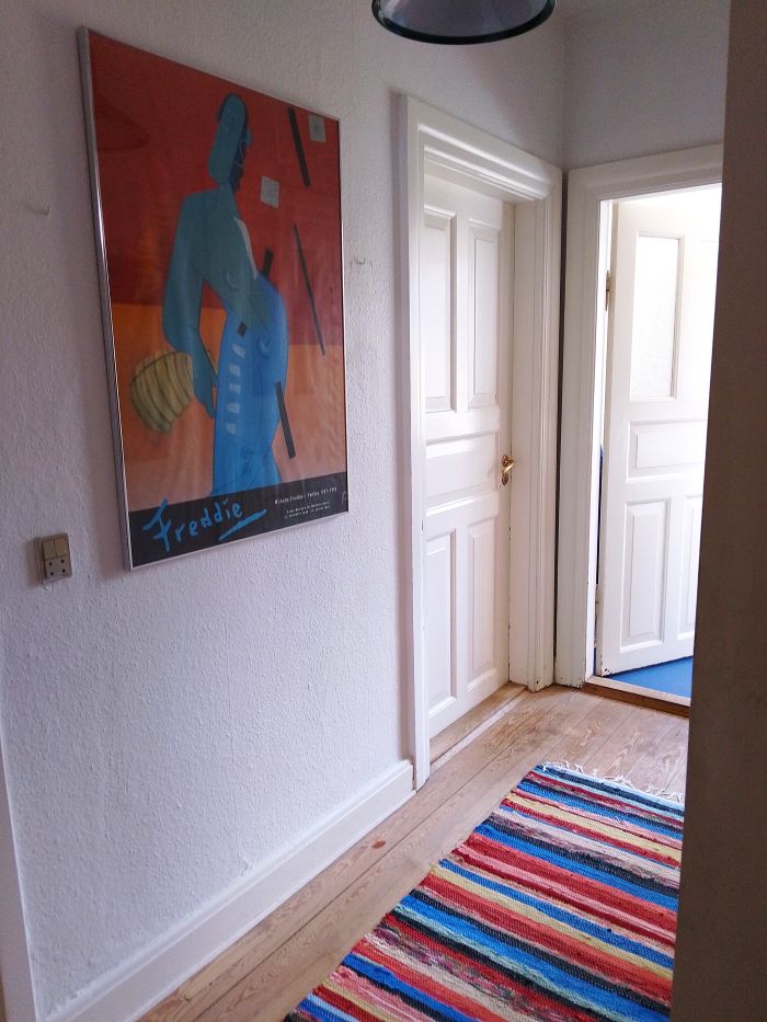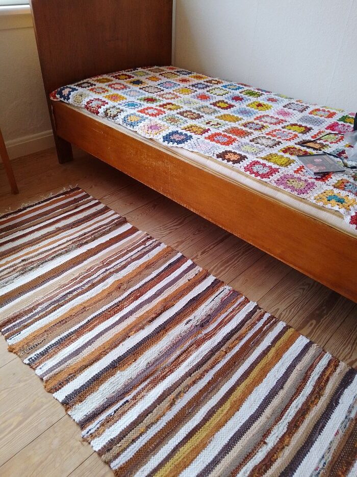 Kludetæppe i samme palette som plakaten på væggen. (Sikkert helt i Freddies ånd!) Vævet på en lille rammevæv uden de store dikkedarer med klude fra en af de københavnske genbrugsstationer.